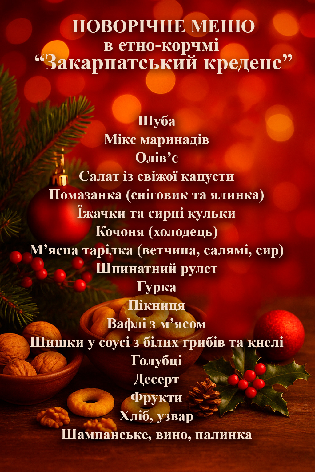 2 варіант Новорічний банкет в етно-корчмі "Креденс" у Мукачеві (вартість 3000 грн): ведучий, музика, дсикотека. Святкове меню дивіться - тут.